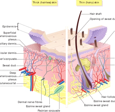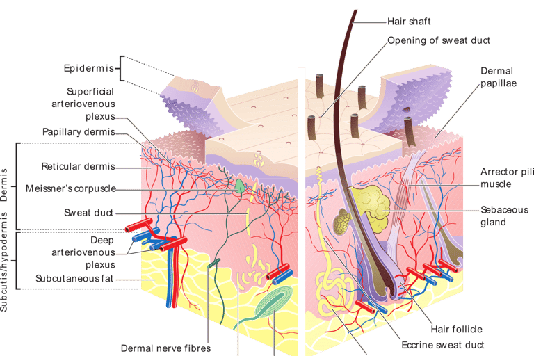 De huid bestaat uit meerdere lagen. De bovenste laag (de hoornlaag) is een beschermende, dode cellagenlaag. Onder die laag bevinden zich levende huidcellen die structuur, vocht, vet en herstelmechanismen verzorgen.